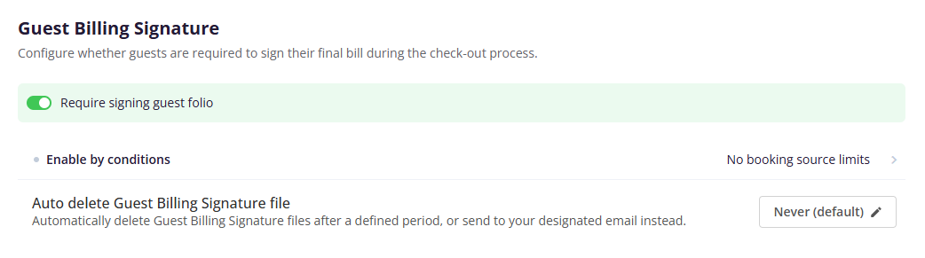 (Optional) Configure Guest conditions to decide which reservations require a signature. Conditions are the same as in Check-in Billing (Booking source, Reservation details, etc.).