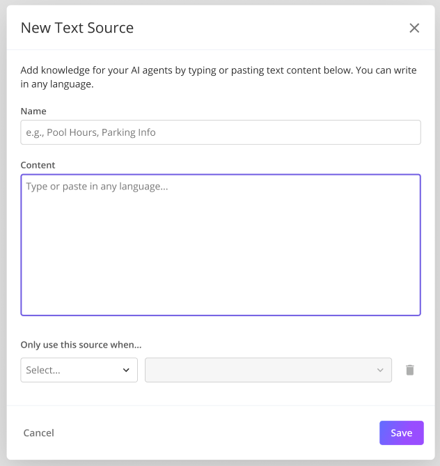 You can add conditions to control when this source is used by the AI, based on guest attributes.