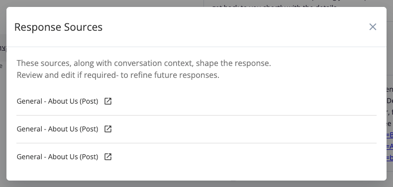 When DuveAI uses information from a text source to answer a guest, the response will show the source name, The source type (Guest App, Upsells etc.)