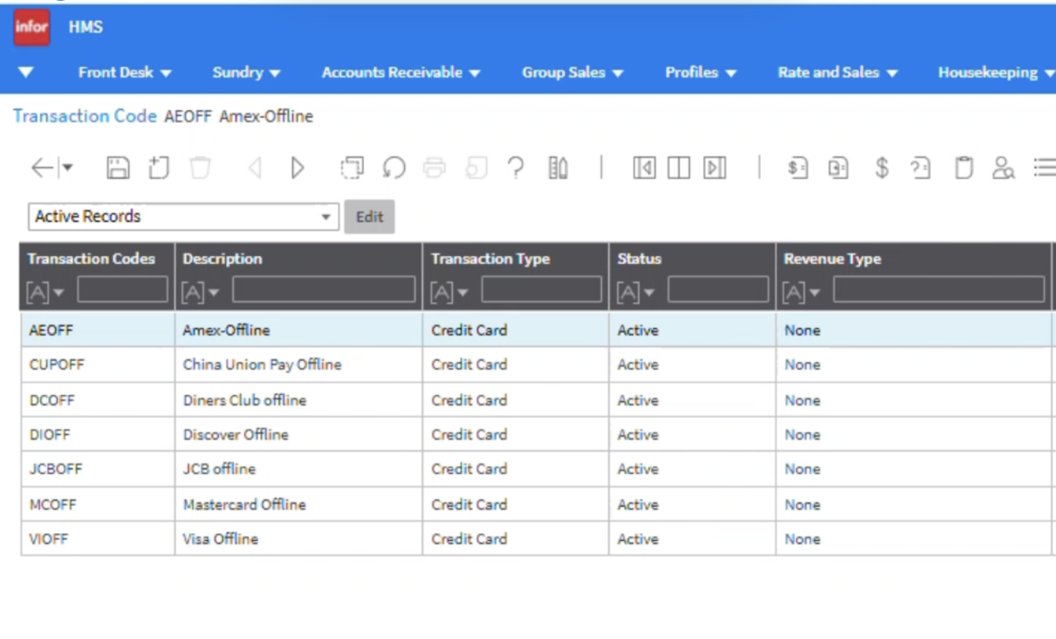 The code will match the credit card types in your Infor account -