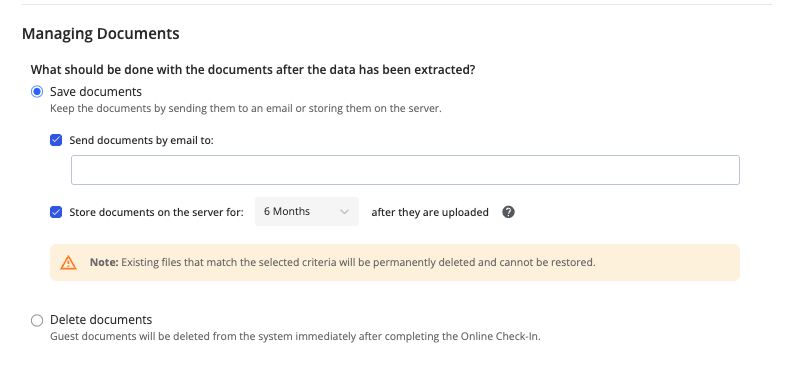 The ID/passport files are not saved on the Duve servers by default, but only are sent to the company’s email box. If you would like them to be saved on Duve's secure storage, please enable the setting in the Required Documents page. By enabling Save or Delete, you can configure what happens to your guests documents.