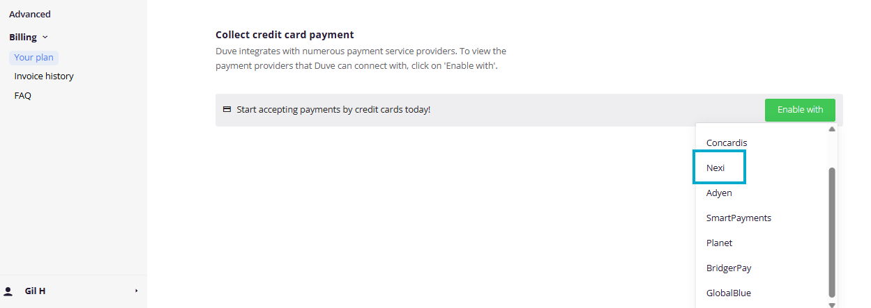 In your Duve Account, Go to Settings>Billing>Enable Credit card payments