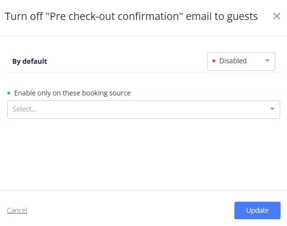 - This feature is disabled by default. You can enable it only for specific booking sources, or enable it as a default and disable it only for specific booking sources.