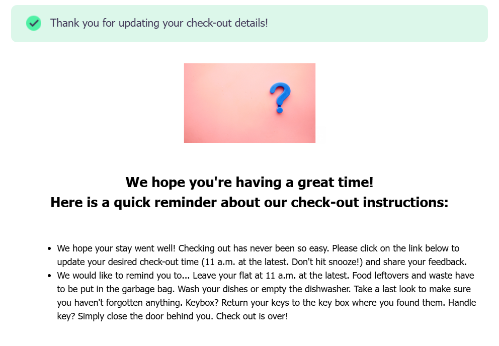 Once completed, the guest will recieve an email confirming their pre check-out details have been recieved including any check-out instructions the host has given.