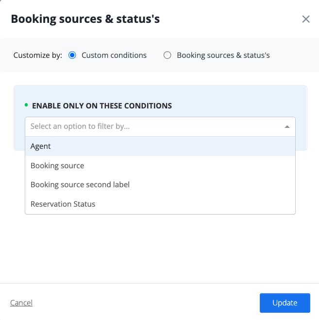 You can also combine the conditions from the regular booking sources & status's to the custom conditions. You can only customize by either Custom Conditions (which has both) or by Booking sources & status's only.