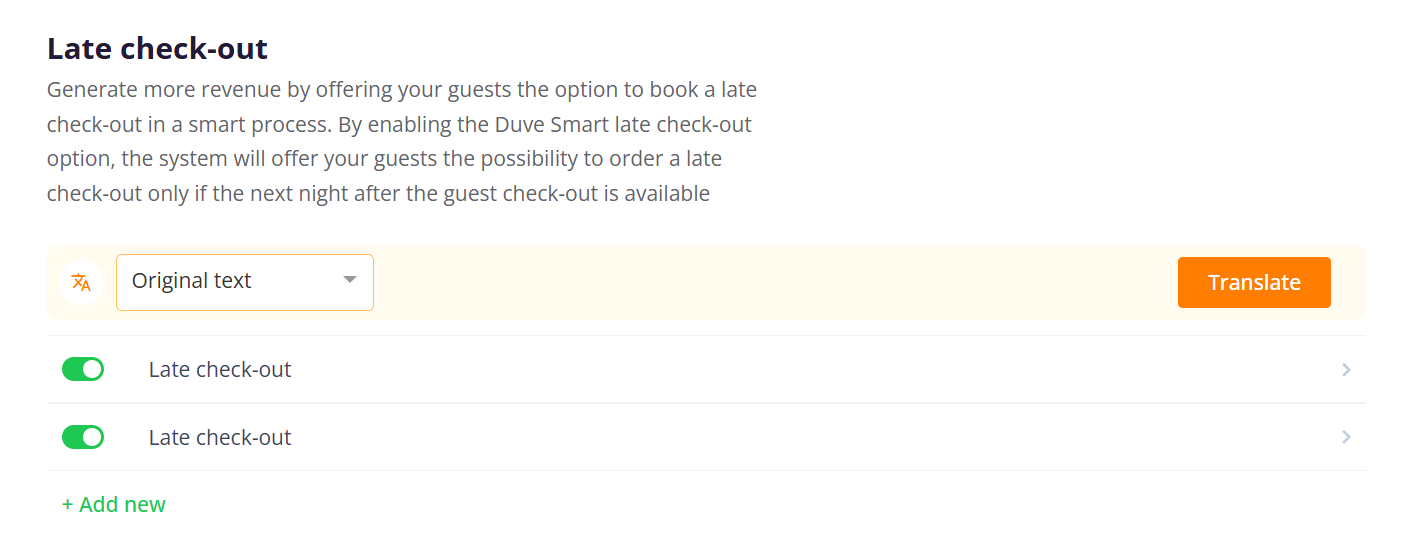 Select '+Add new' to create a custom Late Check-out upsell