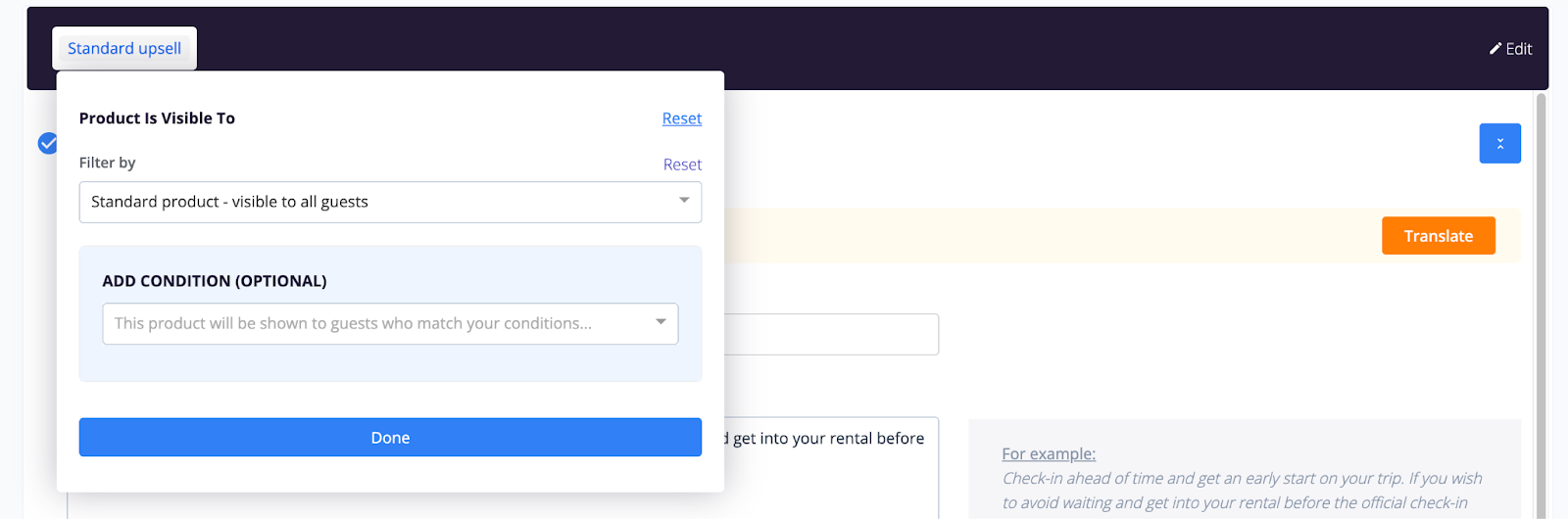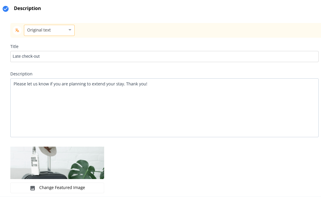 Here you can edit the Title and Description for the Late check-out upsell and add any featured images.