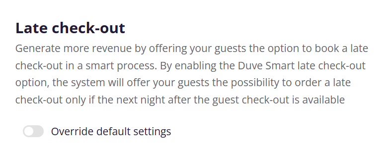Here you can set a paid late check-out which will be displayed during the pre-check-out wizard and in the guest app.