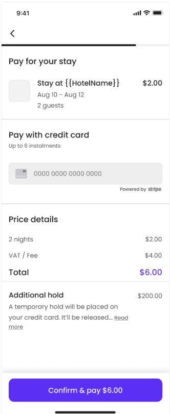 When the guest arrives on the Payment for Stay page, the guest will be able to see a breakdown of their amount due and a dedicated section for the additional hold if that is enabled on their account.