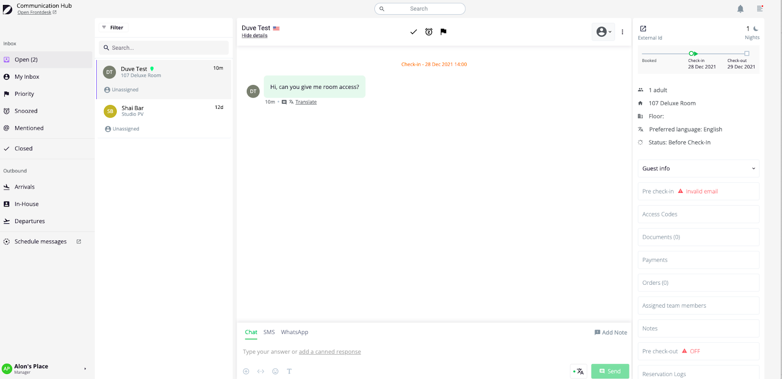 If you are operating a contactless check-in experience, please ensure that the guest has completed the Pre Check-in, uploaded their required documents, and paid for their stay before giving them key access. You can view this information on the Guest Profile on the right hand side of the Communication Hub.